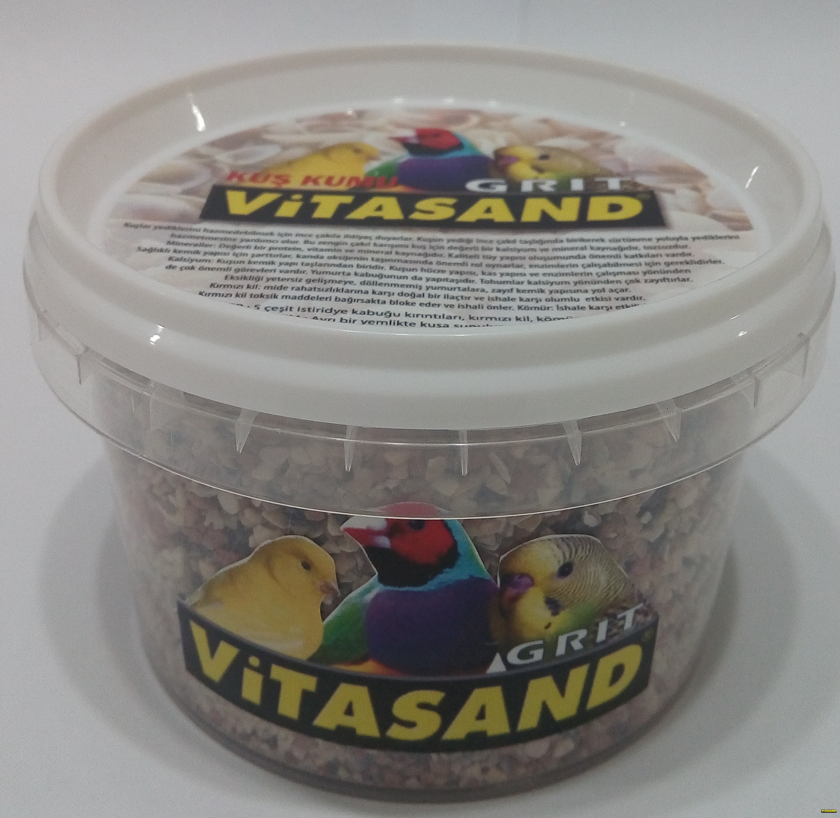 Açıklama: Açıklama: VİTASAND GRİT KUŞ KUMU KASE KAFES KUŞLARI İÇİN 350 GR. Kuşlar yediklerini hazmedebilmek için ince çakıla ihtiyaç duyarlar. Kuşun yediği ince çakıl taşlığında birikerek sürtünme yoluyla yediklerini hazmetmesine yardımcı olur. Bu zengin çakıl karışımı kuş için değerli bir kalsiyum ve mineral kaynağıdır. Tozsuzdur. Mineraller: Değerli bir protein, vitamin ve mineral kaynağıdır. Kaliteli tüy yapısı oluşumunda önemli katkıları vardır. Sağlıklı kemik yapısı için şarttırlar, kanda oksijenin taşınmasında önemli rol oynarlar, enzimlerin çalışabilmesi için gereklidirler. Kalsiyum: Kuşun kemik yapı taşlarından biridir. Kuşun hücre yapısı, kas yapısı ve enzimlerin çalışması yönünden de çok önemli görevleri vardır. Yumurta kabuğunun da yapıtaşıdır. Tohumlar kalsiyum yönünden çok zayıftırlar. Eksikliği yetersiz gelişmeye, döllenmemiş yumurtalara, zayıf kemik yapısına yol açar. Kırmızı kil: mide rahatsızlıklarına karşı doğal bir ilaçtır ve ishale karşı olumlu etkisi vardır. Kırmızı kil toksik maddeleri bağırsakta bloke eder ve ishali önler. Kömür: İshale karşı etkilidir. Kullanım: Ayrı bir yemlikte kuşa sunulur.